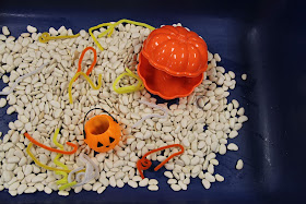 Before playing at the center, we will cut a pumpkin open and explore it’s insides so the students understand the correlation. So often children do not like touching the yucky insides of a pumpkin so this will be a touch friendly version of pumpkin guts.