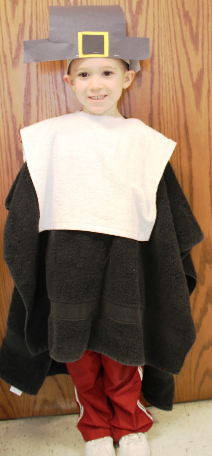 I also replace our regular dress up clothing with homemade pilgrim and Native American costumes. The costumes are made from bath towels. To make the pilgrim costumes, I purchase black bath towels and white hand towels. I fold the towels in half and hot glue the white towel to the middle of the black towel. I cut a half circle on the crease of the fold so that when you open the towels they have a circular opening for the children’s head. The students wear them like a poncho.