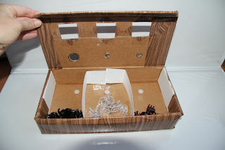 I then cut three squares on the top of the box and outlined them with white, black, and brown For black and brown outline, I used permanent marker and for white outline I used an Elmer’s Paint Pen. Next, I taped two pieces of cardstock as dividers for inside of the box so it could be self checking.