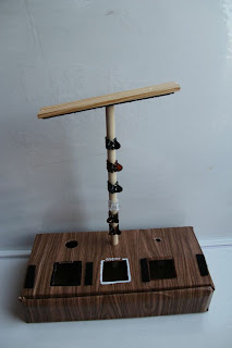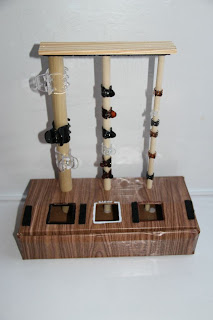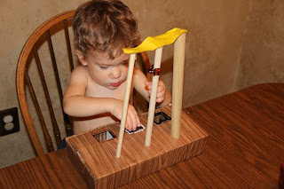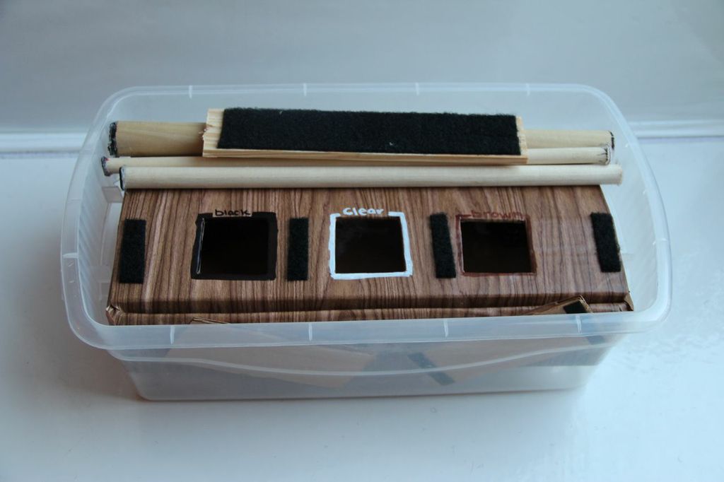 All I did to make the task was cover a box with contact paper and trace the tips of the dowel rods on to the top of the box. Then, I used an exacto knife to cut out the holes. I put Velcro on the bottom of each dowel and the inside of the box to make the dowels more sturdy and to make them removable for storage purposes.
