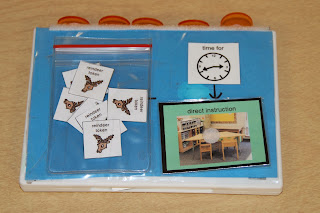 The front of his schedule was simply a "time for" icon and then a Velcro spot to add an icon for his next activity. When we started the Reindeer Reinforcement, I simply moved the "time for" icon over and added a Ziploc pouch for the student to earn reindeer each time he transitioned to a new activity.
