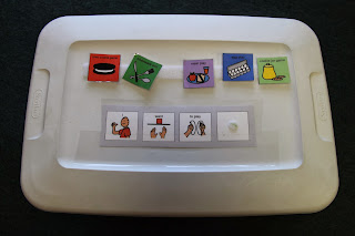 The beauty of this schedule is that all his preferred items are in one small area in the classroom. Each time he earns one, he is asked to match the icon to the preferred items in that area. Then, he can play with the preferred item.