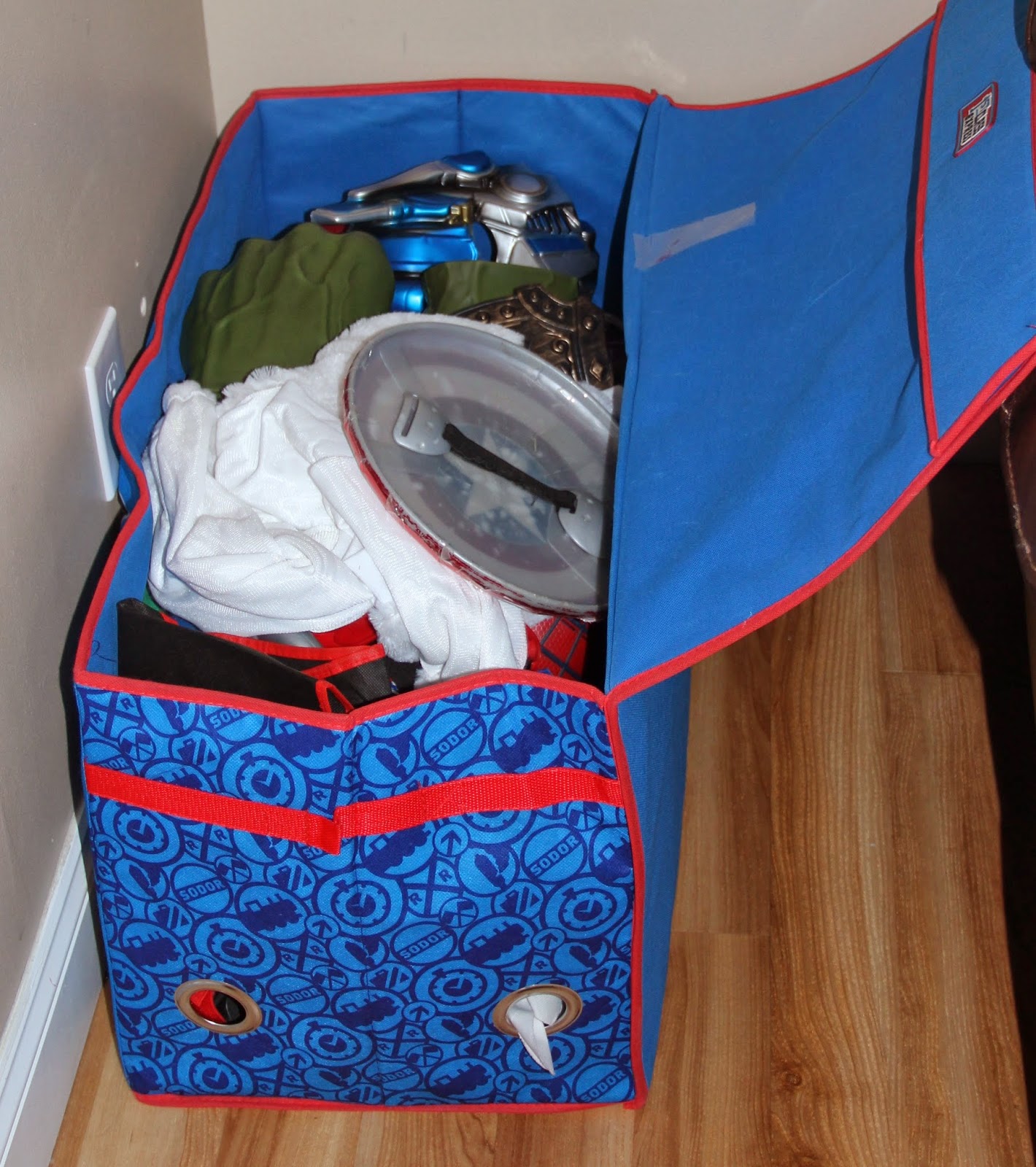 Lastly, I would like to share an extreme interest for both boys.  They both love to watch cartoons and movies.  But they always do it in McDaniel boy fashion...they dress up like the characters they are watching whether it be Spiderman, Captain America or the bunny from HOP.  I store all their costumes in a large fabric Thomas Chest that my mom picked up at Toys R Us last year for Christmas.