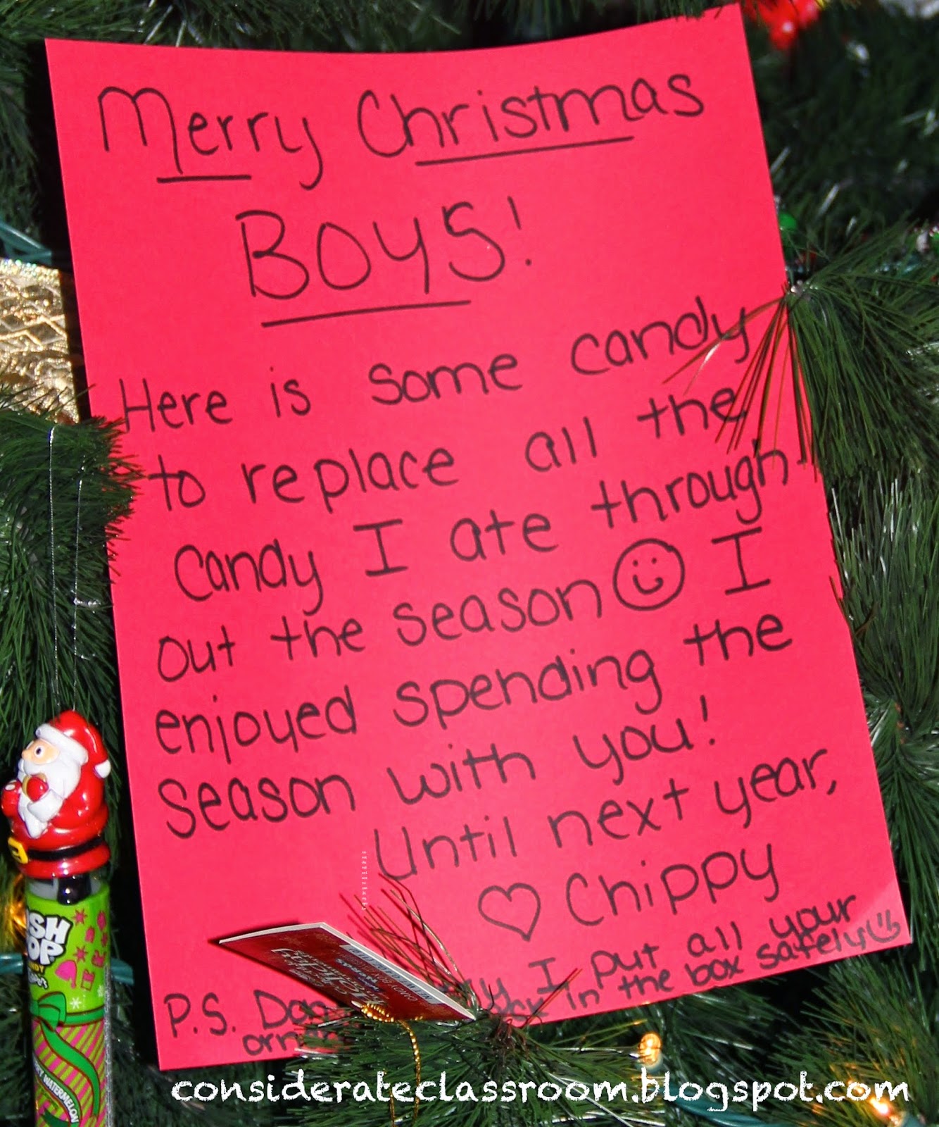 With this note: (Daddy staged Chippy eating the boys' candy all season last year :) )