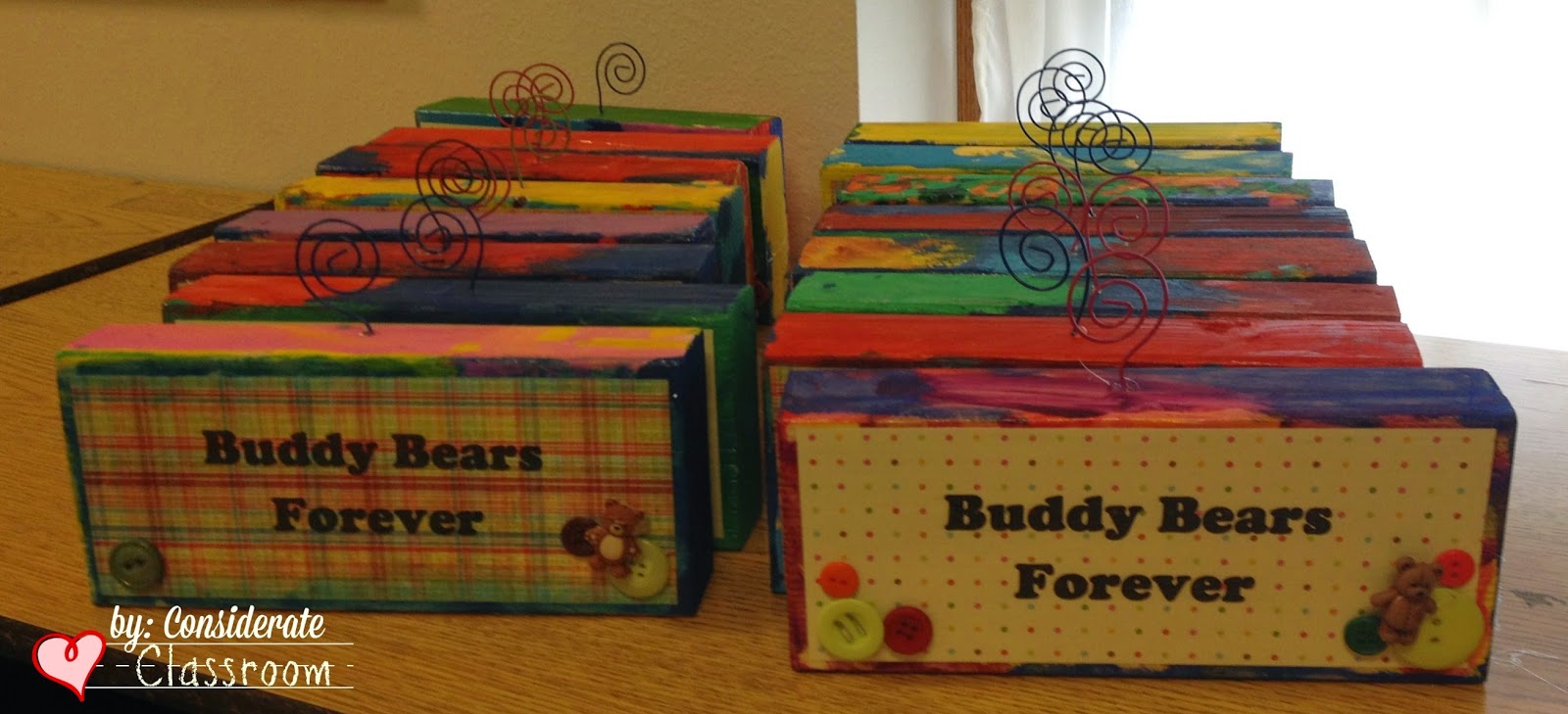 13. Class Memory Block This gift was created by and for each of the Buddy Bears last year. They each painted their own two by four then we modge podged scrapbook paper with the words Buddy Bears Forever on the front and drilled a hole in the top for a spiral paperclip to hold a class photo.