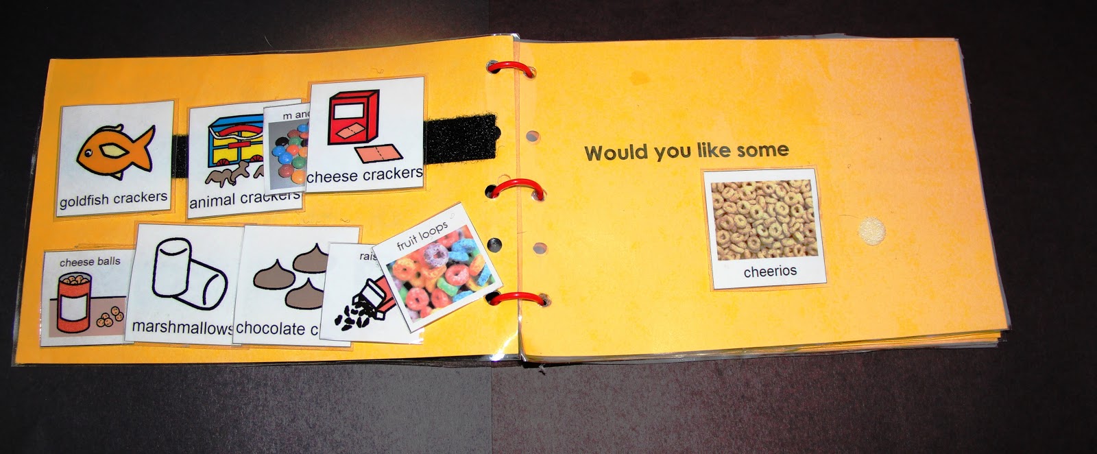 The students then create their own personal trail mix. Each student uses visuals from the social story to request the snacks they would like to put in their paper sack.