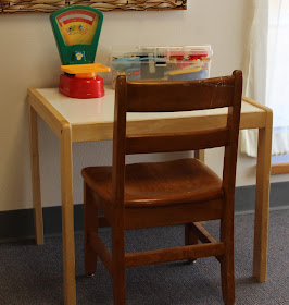 | The Receptionist's Area: I use toddler locks to make the pretend kitchen items off limits |