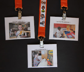 For instance, on the name tag that says "I am a vet.", I added play prompts like "I check the animals heart.", "I give them shots." and "I check the pets' ears and throats." On the name tag for the customer, I put prompts like "I bring in my cat or dog.", "I listen to the vet.", "I pay the receptionist.". The receptionist's name tag says "I listen to the veterinarian.", "I answer the phone.", "I take money.", and "I book appointments.".