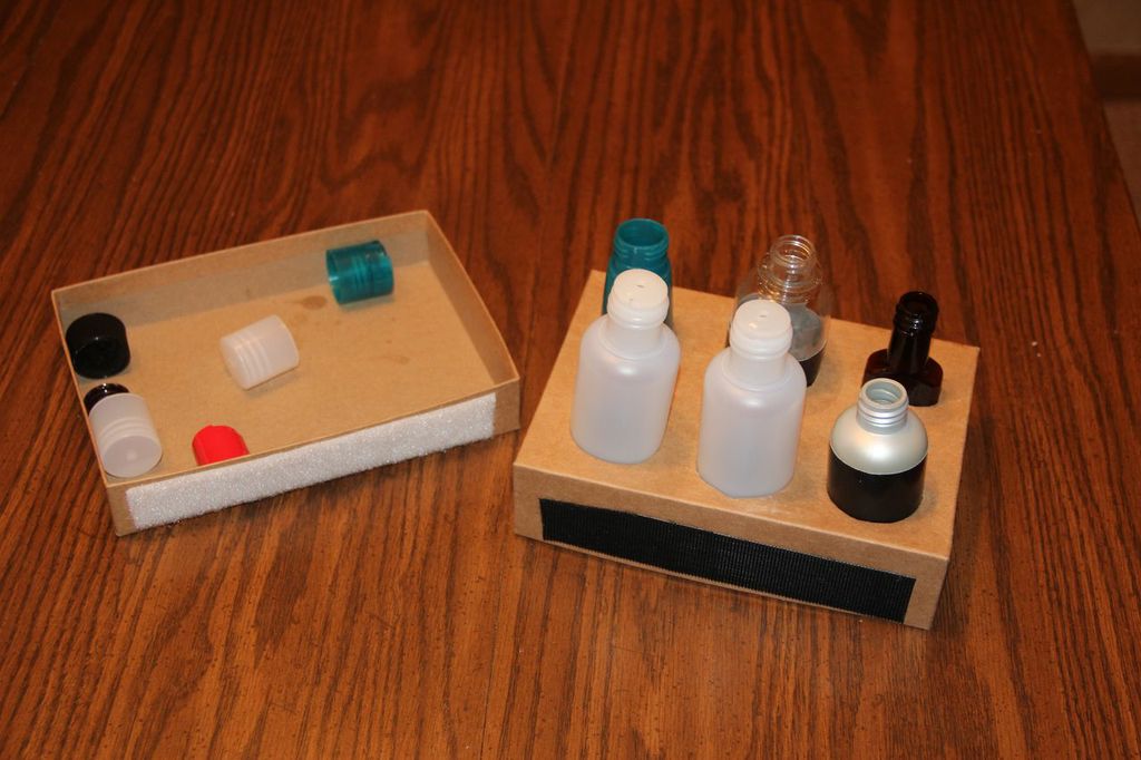I simply collected six travel-sized containers with lids and traced the bottom of each of them on one of my favorite reusable boxes, a Birchbox. Then, I used an exacto knife to cut out the openings for each container. And voilĂ ... a new matching & fine motor skill task that works on functional self-help skills, too!!