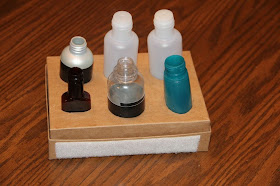 I simply collected six travel-sized containers with lids and traced the bottom of each of them on one of my favorite reusable boxes, a Birchbox. Then, I used an exacto knife to cut out the openings for each container. And voilĂ ... a new matching & fine motor skill task that works on functional self-help skills, too!!