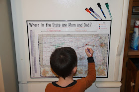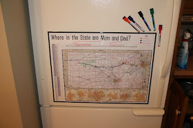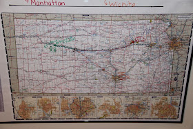 Then, I simply framed the map and added a key to represent both mom & dad's travels. (My husband is a flight medic and flies to small and large towns throughout Kansas adding to the daily Kansas geography lessons for our boys.)