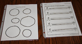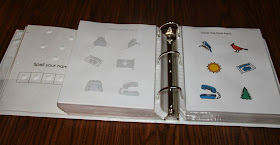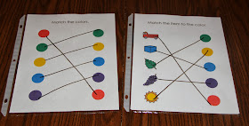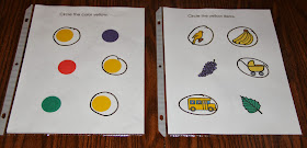 Several of the worksheets in the binder come from three early learning concepts books I bought through our Scholastic book order points several years back. The other worksheets included in the binder were my own personal creations.  They are leveled worksheets that work on color matching and sorting, among other skills.  The importance of making them leveled is to present them to each child in an errorless fashion.  For example on the first level of "Circle Yellow, all the objects on the page are yellow.
