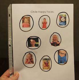 They continue to be a work in progress as I create more when I see specific needs for specific students.  For instance, just last week I noticed a student having trouble differentiating between happy and sad.  As a result, I developed this set of worksheets. Here, the student is to circle happy with all the photos on the page being images of happy children. Then at a higher level version, the student is to find the happy faces amongst the mixture of happy & sad images.