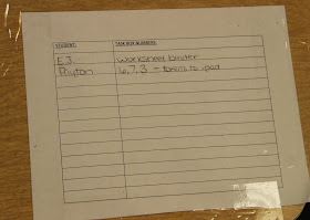 As mentioned in the video, I use a chart with the students' names and the task numbers each student needs to work on as the lesson plan that drives instruction.  I have created an example using my sons.  Here is a picture of what their chart looks like.
