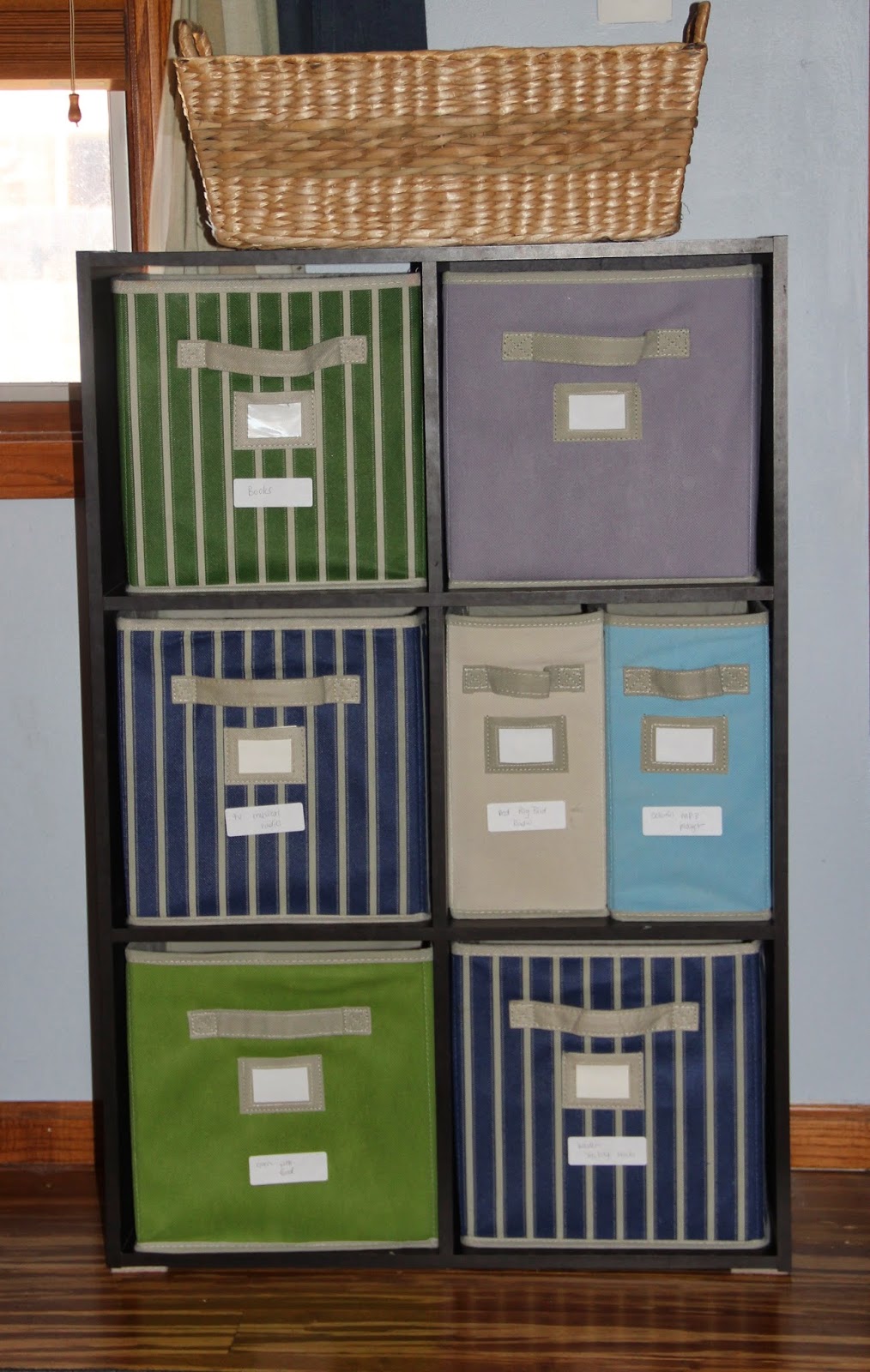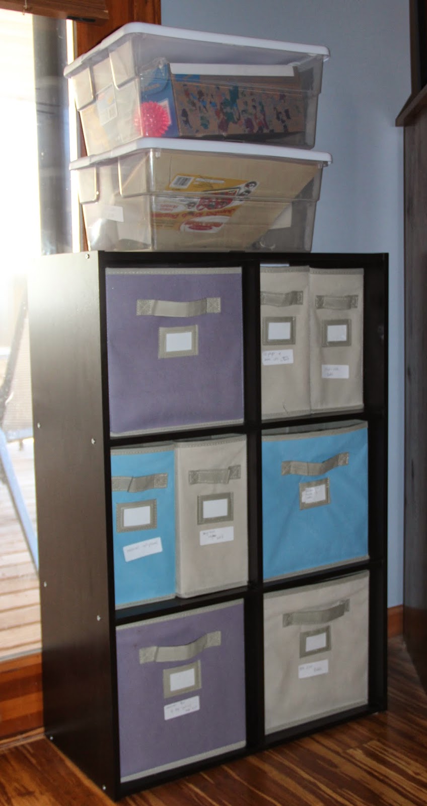 They bought a few extra fabric boxes and then her mom went through the family toys and placed one toy or put in task in each box. (Notice the new boxes they found at Home Depot. They are in half sized sections. So exciting for us organization geeks!! :) I purchased some for our literacy center so we can double the amount of leveled boxes we have!)