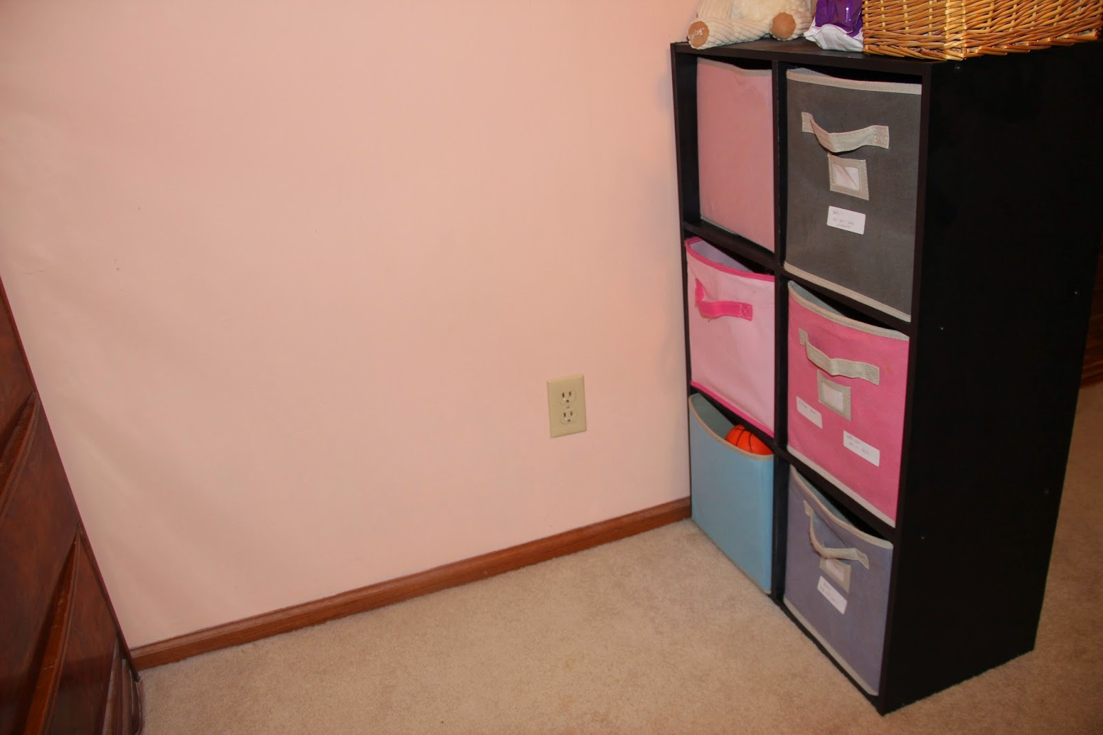 NOTE: Her dad mounted the shelving units to the wall so if she pulls herself up with them they would not fall on her.