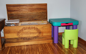 To the left side of her table, her parents have repurposed a wooden chest to hold all of Natalie’s tasks.