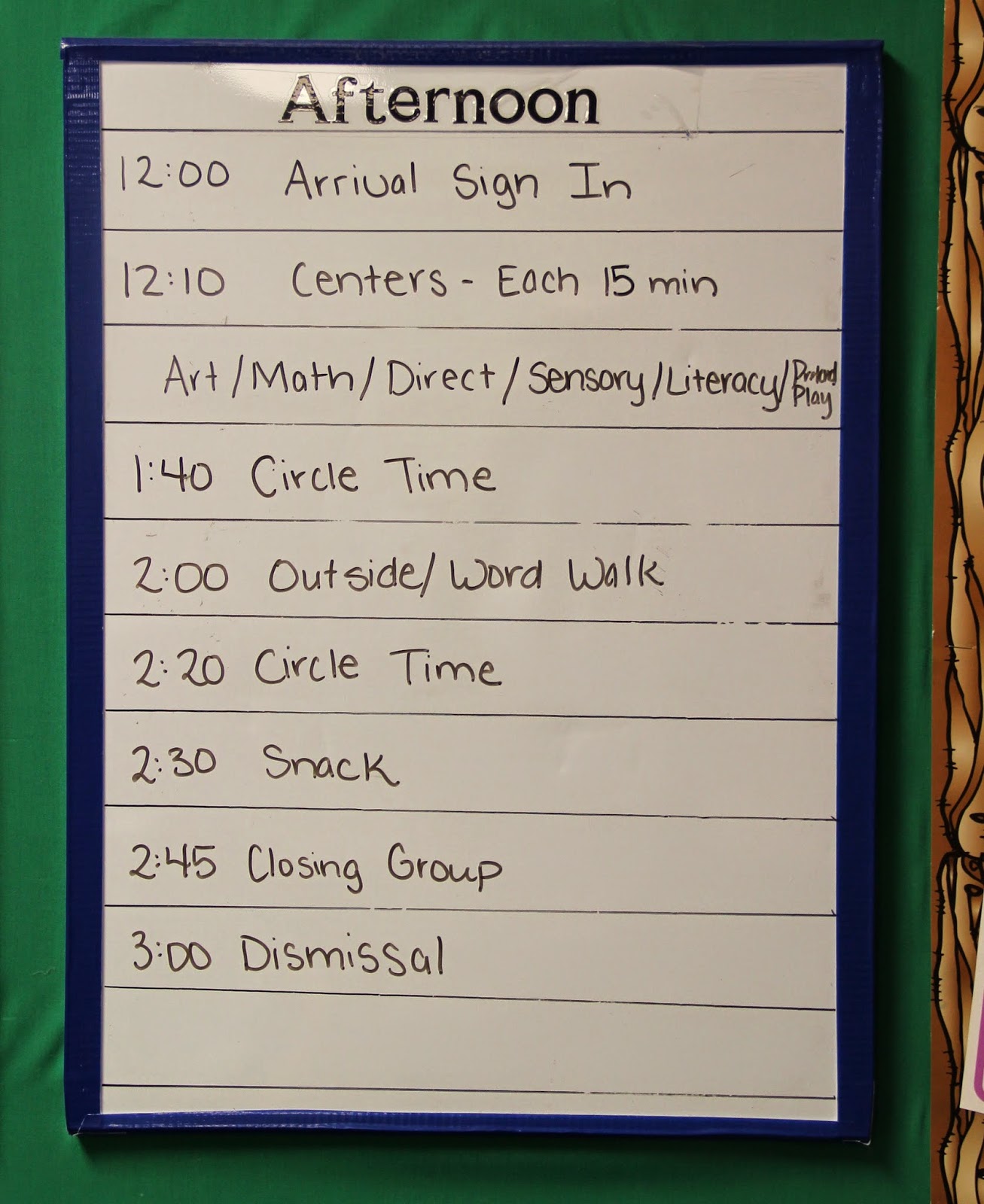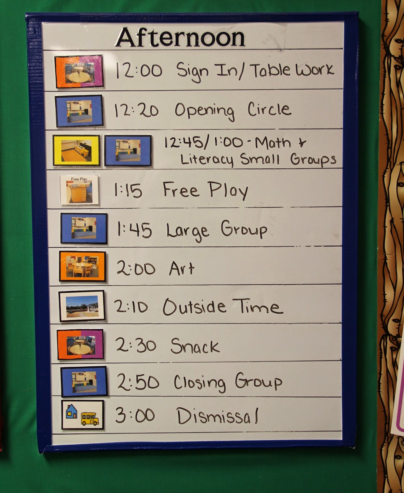 So let’s take a peek into the new routine. First off, the kids work through a class schedule. Below you can see what it looked like before and what it looks like now. Before it was for the teachers to follow. Now it has pictures added for the kids to follow too.