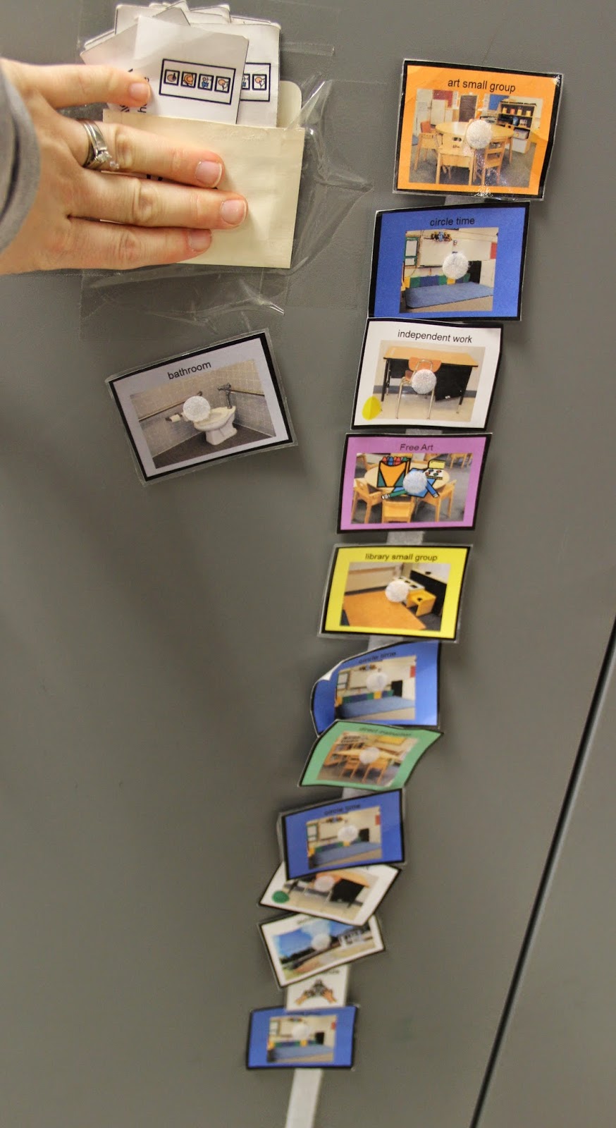 It should be noted that some of the students still have their own individual schedules. However when we can, we have all the students transition as a whole group using typical transition items and cues. For example, a song leads us to opening group time or the passing out of art materials leads us to whole group art. So inevitably, there are less icons and transition match ups.