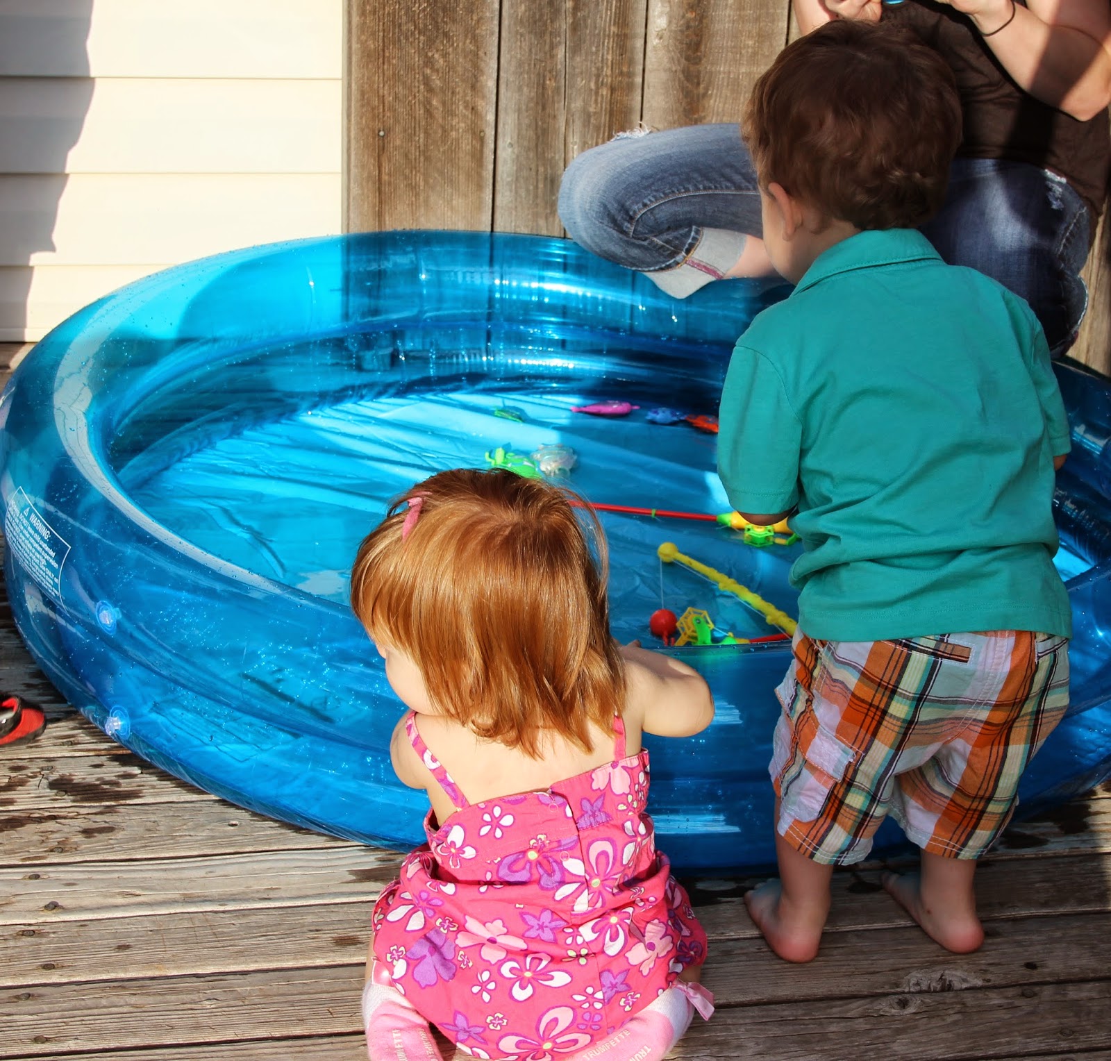 After the piñata, the plan was to go swimming in our pool. But it was too cold so the kids just used their fishing nets to go fishing in a small inflatable pool.