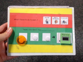 Following the time on the iPad, the staff person is done prepping the tables and they both go back to group as a layered grouping feature best meets the needs of the student and uses staff time efficiently. Here is the back of the DVD token system. It is the student's picture schedule. It says "Time for circle time!". Other picture icons are stored on a Velcro strip inside the DVD case. It's so compact...a motivating system and schedule all-in-one!