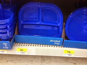 The mats are $1.97 placemats I picked up at Walmart and cut in half and then traced a cup and tray outline on them with a permanent marker so that the kids could practice one-to-one correspondence as they set the table and know exactly were to place the trays and cups. The trays and cups are also purchased from Walmart. The trays are $0.98 and the cups are 2 for $0.88. You can find them in the kitchen section.