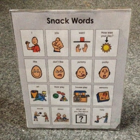 Not a lot to say about actual snack time other than we try to support our kids in using language at snack so we have little snack language boards to support requesting and conversation.