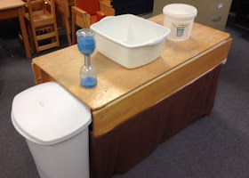 When the sand is all gone, each child is in charge of going to the table to dump and put away their snack items.
